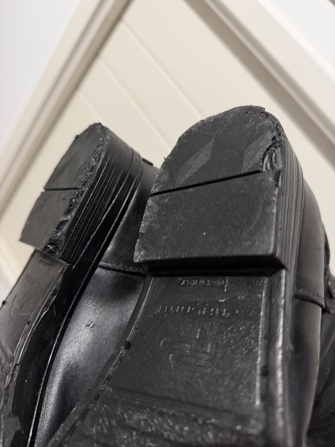 J’ai dû les mettre au placard quelques mois (stockées dans un sac à bottes en intérieur), et surprise : la semelle a comme « fondu ». C’est très collant, et des petits morceaux restent accrochés au sol quand je marche avec. Elles n’ont pourtant pas pris l’humidité ni la chaleur.