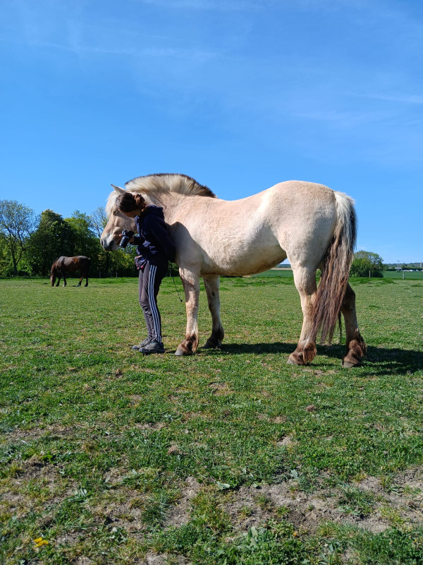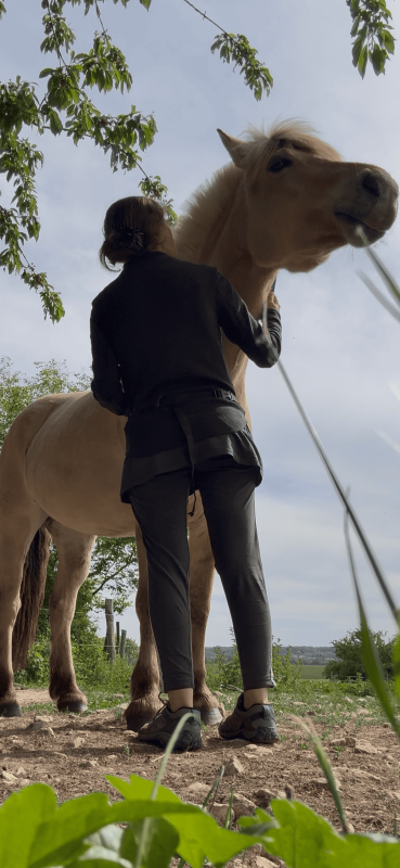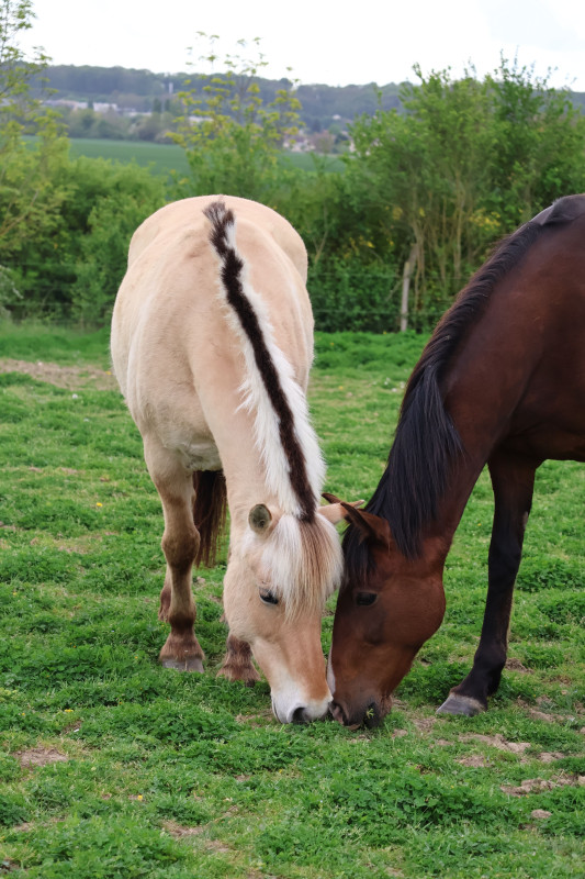 Les 2-3 derniers jours, je sortais sur de très courtes distances en main (quelques mètres seulement) ; j'avais mis en place un code vocal assez simple qui était « stop » pour arrêter et « ok » pour autoriser. Néanmoins, j'avais l'impression qu'elle ne comprenait pas, et ce malgré ma posture et malgré le fait que je demandais les choses de manière constante à chaque fois, en veillant à bien récompenser quand elle trouvait la bonne réponse. J'y ai donc pas mal réfléchi hier, et j'ai tenté de changer le « stop » par une onomatopée franche, reconnaissable et sans ambiguïté, une sorte de « tch-tch ». Cette fois-ci, nous sommes restés sur la zone d'herbe à côté de l'aire de pansage, donc intéressante pour travailler cet aspect-là. Alors évidemment, il fallait le temps qu'elle comprenne ce que je souhaitais, mais j'ai trouvé qu'elle y était bien plus réactive et que cela lui « parlait » plus. Donc j'alternais entre le « tch-tch » et le « ok », pour qu'elle fasse la différence entre les deux, et en lui laissant des moments plaisants pour elle où elle pouvait brouter. Cette petite séance a duré en tout et pour tout une petite dizaine de minutes. Alors évidemment, je ne crie pas victoire non plus, et à voir sur une véritable balade en main, mais je suis TRÈS contente.