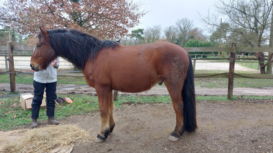 A priori, il n'y aurait aucune autre pathologie qui expliquerait ses difficultés. Son parage semble lui convenir et est régulier, il se déplace correctement, se tient au carré facilement... Je n'ai pas remarqué de postures compensatoires mais je me demande s'il n'a pas une gêne au dos parce qu'il n'apprécie pas trop que je le dépoile sur la zone derrière le garrot en ce moment.