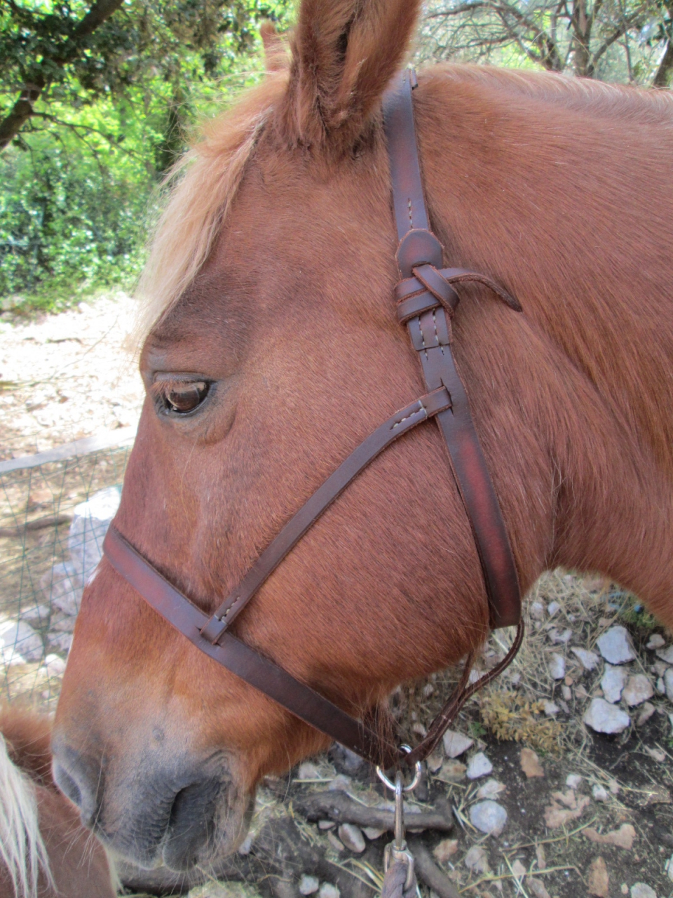 Voici un licol decathlon basique avec en bouclerie de muserolle un espère ce carré où un côté à 2 angles. Ces angles ont blessé mon cheval ! On voit même le bobo sur la 1ère photo.