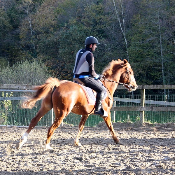 Après une assez longue détente, on a travaillé beaucoup l'incurvation. Kim nécessite un travail important des jambes, en particulier au galop : dès qu'on se relâche il retombe dans le trot La mono va m'inciter à être très très léger sur les mains et à le diriger au maximum avec les jambes. Effectivement ça va dans le bon sens.