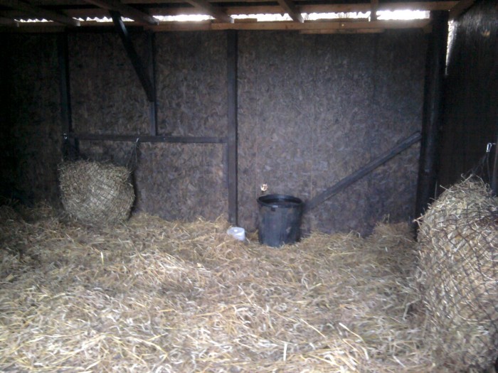 donc remise en état de l' abri ( foin avec l'installation des filets, paille et eau )