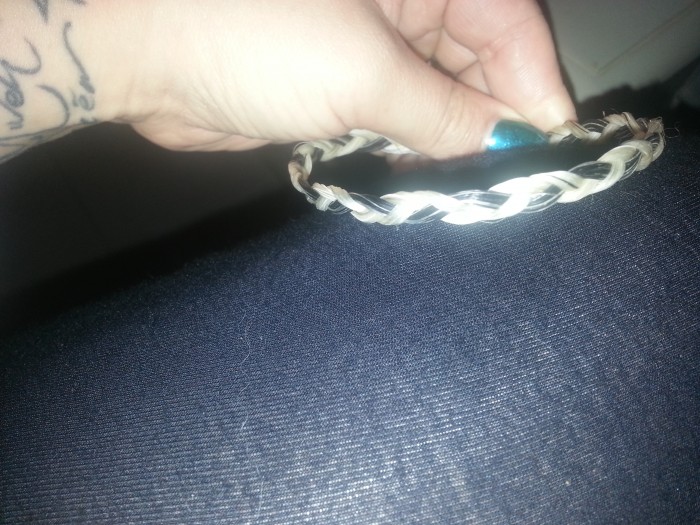 Par contre, je ne pense pas pouvoir prendre une mèche sur des poneys qui ne m'appartiennent pas! Les crins récupérés sur les brosses, je ne pense pas que ça aille pour faire un bracelet, tant pis!