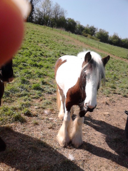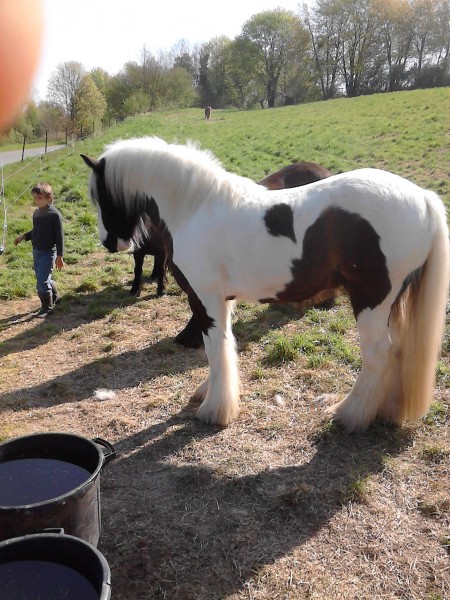 Je le sais, il est très grégaire et je le surveille; je le vois passer sa tête entre le camion et le van, il hennit. Je reviens: un copain me prévient qu'il a voulu enjamber la flèche. Je le détache et nous partons brouter près du paddock de détente et près du carré de dressage.