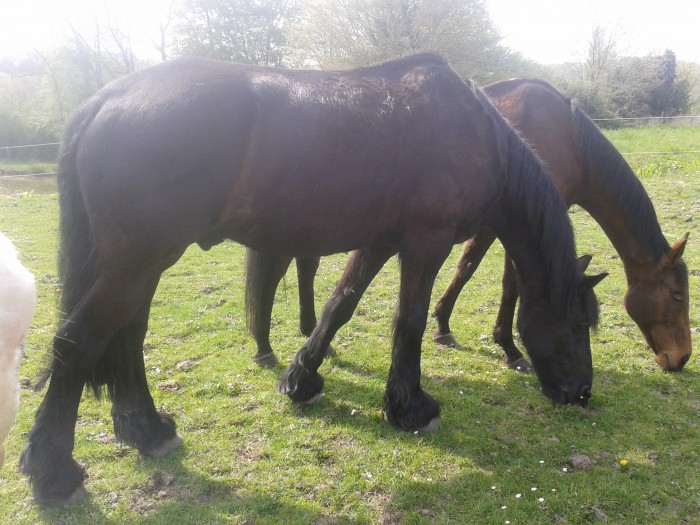 Au club, les poney sont souvent en liberté par 2 ou 3 à tour de rôle, c'est super de les voir évoluer, surtout quand ils galopent avec le pur sang à la retraite d'un propriétaire qui fait un bon 1.75, lui aussi il reste en liberté car il a des problème aux pattes du à son passé en course et son propriétaire ne vient jamais le voir,ni s'en occuper; du coup au club ils ont décidé de le laisser dehors la journée et il s'éclate avec les poneys et vient voir les cours, mendier une carotte etc, ils sont chous? choux??