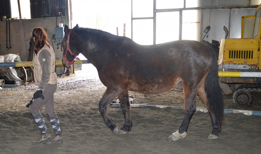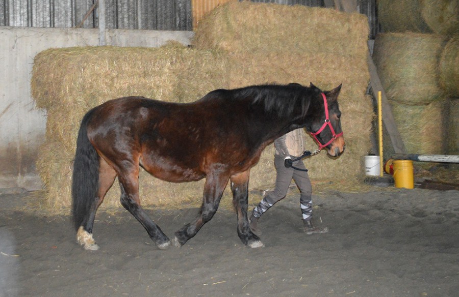 Des balades au pas actif (il faut qu’elle engage afin que ce soit bénéfique) et si possible avec des montées et des descentes afin de lui faire les abdos (et donc remonter le dos). Toujours dans la décontraction et la descente d’encolure… en gros Tracy est à muscler comme un petit jeune après débourrage.