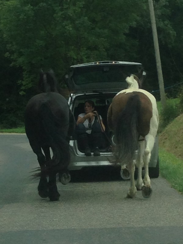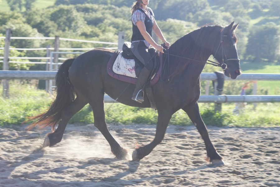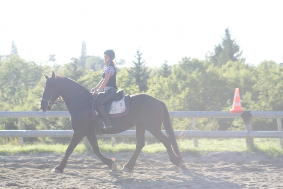 Puis vient la répétition .... la miss était surexcitée, elle baissait les oreilles sans arrêt auprès de la jument avec laquelle nous faisons le couple pour le botte à botte !!! je la réprimande à chaque fois !!! en fait, en la ralentissant et en restant légèrement en arrière de l'autre juju, (qui maintenant à un peu peur de la miss !) ça va beaucoup mieux ... puis encore petit un coup de cul au trot ! ... je la remets direct au travail !!! .... je suis morte, je meurs de chaud ! mais heureuse car j'ai réussi à gérer mon petit monstre .... que j'adore
