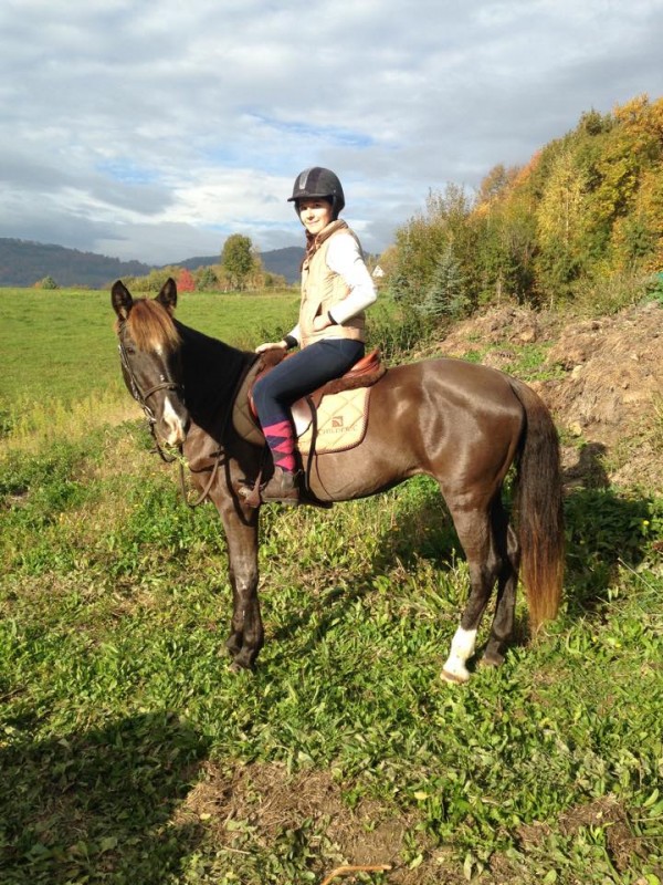 Vu qu'elle est très sensible des reins (problème d'ovaires), il faut la monter les jambes bien en avant, et être hyper délicat dans les demandes et les aides sinon elle envoie des coups de cul et se braque contre le mors...