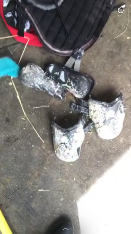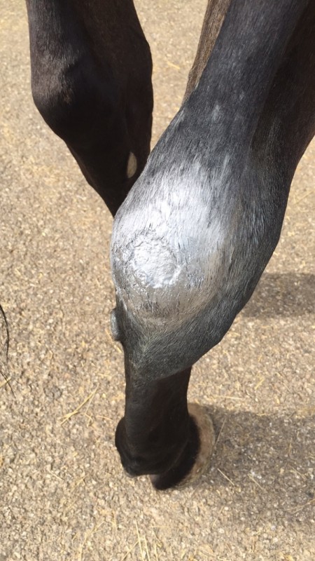 Steph m'avais dit de voir car elle s'est blessée en tapant dans le box (je pense qu'elle en a marre de rien faire). Elle lui avais mis de l'argile alors je l'ai sortie, j'ai pris un gant et j'ai douché la plaie et l'argile afin de l'enlever pour voir si c'était propre et enlever les croutes d'argile séchée. La plaie était refermée mais séche, donc je n'ai pas remis d'argile mais de l'aluminium en spray, après avoir désinfecté et nettoyé. L'alu permet de garder l'humidité de la peau et donc ca n'assèche pas la blessure.