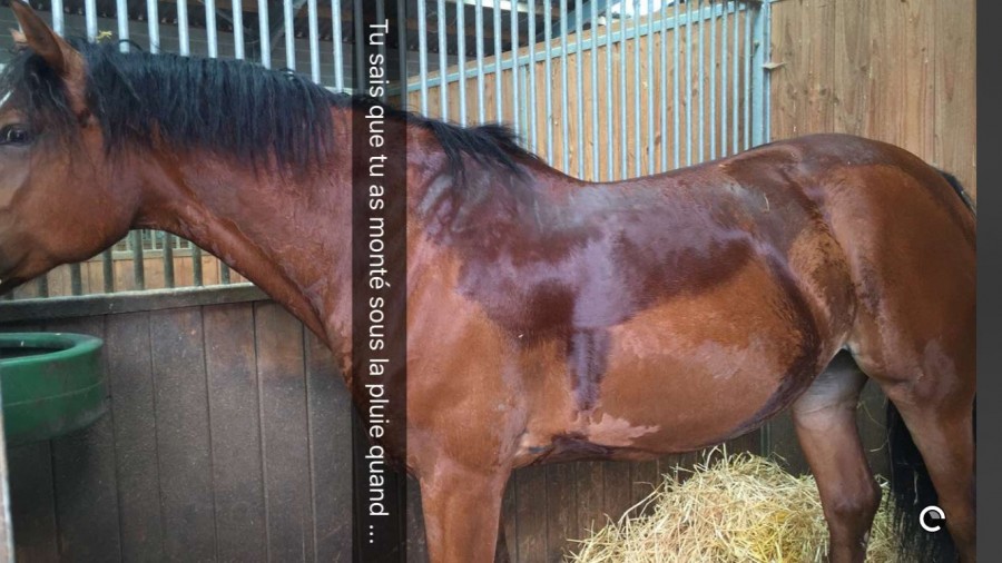 Samedi avant mon cours même chose, contrôle de la plaie, je remet de l'alu et je la marche autour de la carrière. Arrive mon cours, c'est plus que noir tout autour de la carrière. On monte dehors, on commence à détendre et ............... GROSSE FLOTTE genre triple averse, tous trempé, la mono qui dit " On rentre ?" eh nous ben .. Euh foutu pour foutu on peut rester on dégouline tous .. On continue, il pleut de plus belle, je suis en t shirt