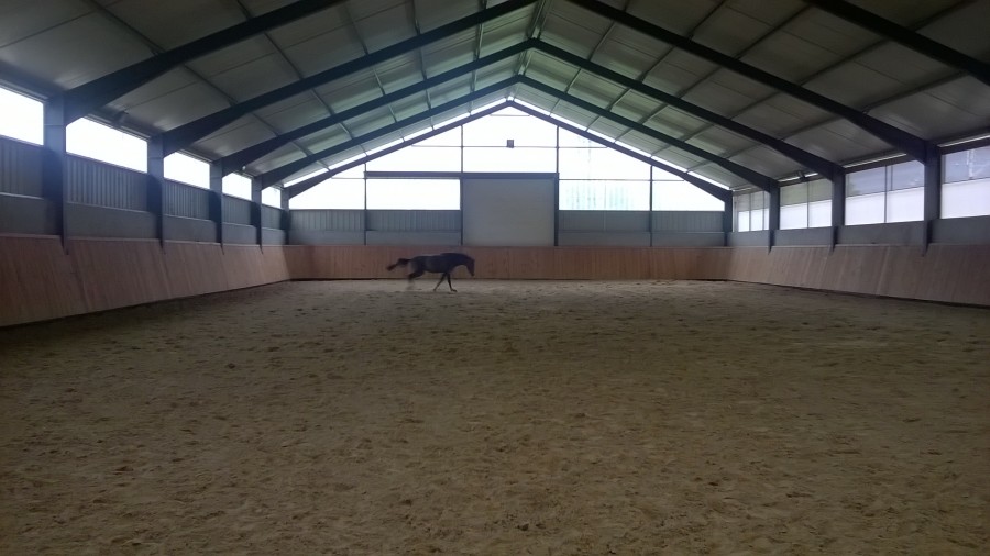 Pour le coté pension, les chevaux sont 100% dehors, à 2 ou 3 par paddocks, belles clôtures propres, abris en dur avec eau et foin en permanence et distribution de ration et compléments si besoin. Accès à des chemins de balades partout, accès à un grand manège magnifique (je vous mets la photo plus bas). Un intervenant spécialisé dressage montant en pro vient également (donc cours possibles) ; de plus il y a un centre équestre juste en face de la pension si besoin ! Et la pension est très sécurisée, impossible d'y rentrer comme ça !