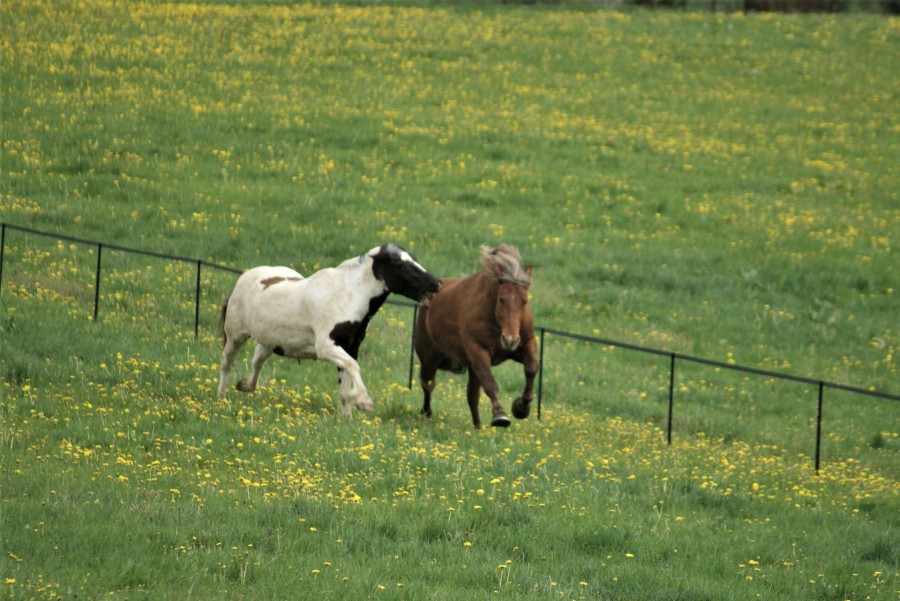 Pour le moment, elle ne se mélange pas car elle scrute son poulain dans l'autre pré, d'ailleurs elle a fondu; mais c'est une teigne!