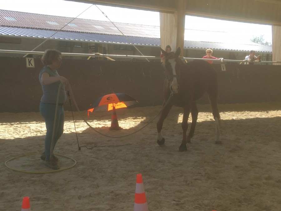 Mais ça n'empeche pas de commencer doucement le travail. Je le longe donc une fois par semaine (je l'ai 3j), avec pour objectif un bon engagement des postérieurs et une attitude basse. Il faut qu'il travaille dans le bon sens, c'est un cheval qui a tendance à lever la tete donc on travaille autour de ça. On travaille en lignes droites et en très larges cercles pour varier.