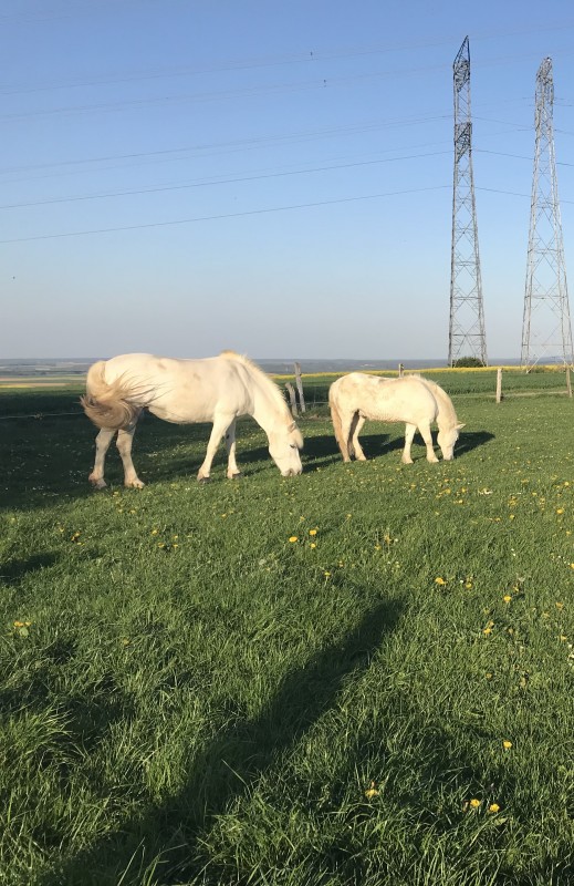 Je me tâte à ne la laisser que le matin au pré pour limiter le grignotage d'herbe...je voudrais éviter de devoir la laisser la journée entière au paddock, je n'ai pas envie qu'elle me fasse une dépression non plus!