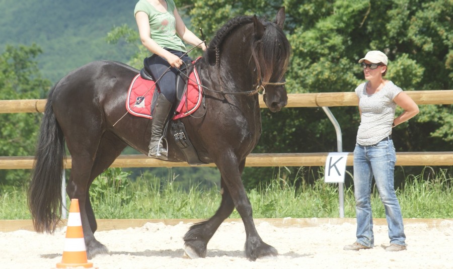 Quand j'arrive à mettre ma jambe à fond, elle fuit avec l'épaule extérieure, et quand j'arrive à avoir le devant bien, elle débraye de suite car ça lui demande de pousser derrière