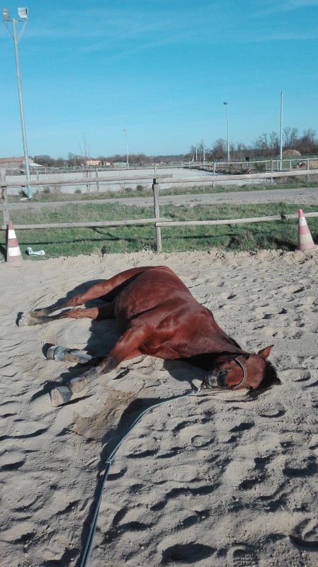 Donc voilà le concept de séance de travail à pied selon l'Affreux Poney, il s'est couché et il a réclamé sa carotte