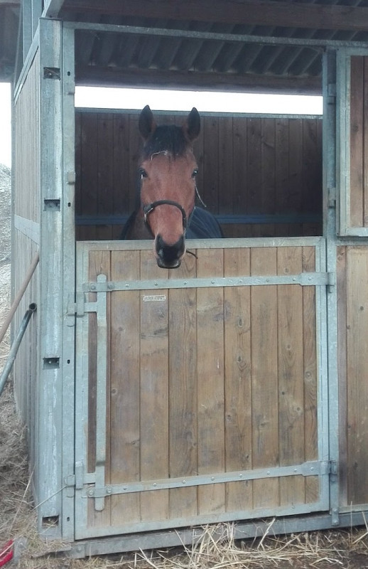 J'ai préparé le box "luxe" de la pension en 4m*3,5m, qui a une grille sur la porte (ça m'arrange, je le sais capable d'essayer de sortir...), et j'ai installé le Gros avec filets à foin et tas de carottes. L'Amour de sa vie fait des A/R au galop dans le pré, et lui lui répond. Nickel.