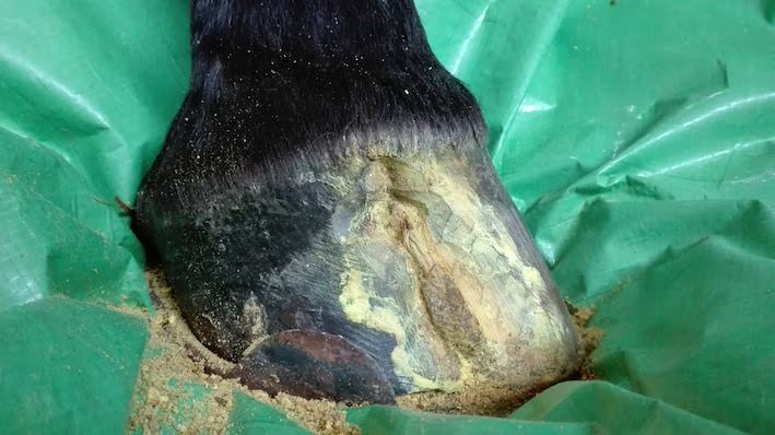 Par chance, le pied ferré rentre dans mes anciennes hipposandales (qui étaient plus grandes, car pour ces antérieurs). On peut aller marcher en protégeant le pied de la boue et des chocs sur le goudrons