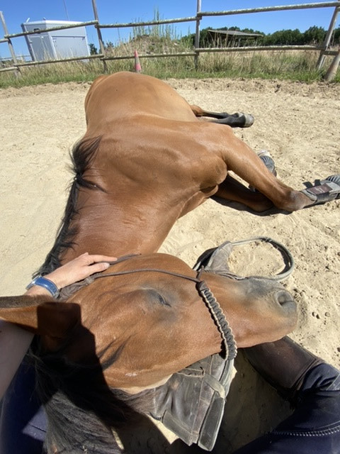 Ha oui le PS qui ne ressemble à rien en temps normal) , un trot tonique mais décontracté, un contact parfois un peu compliqué dans les EED, dans les courbes à droite, mais parfois hyper moelleux car il tend vraiment sa rêne externe et est très souple dans les demandes de pli. Vraiment quand je m'efforce de mettre de la rigueur dans ma détente, à ne pas accepter des transitions et une cadence incorrectes à AUCUN moment , à croise qu'on aligne les os comme il faut