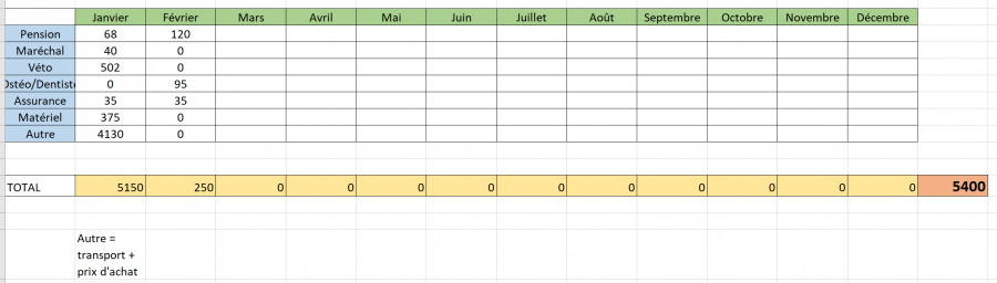 Pour apporter ma pierre à l'édifice, voici le budget passé dans mon cheval depuis le 5 janvier, jour où je l'ai acheté !