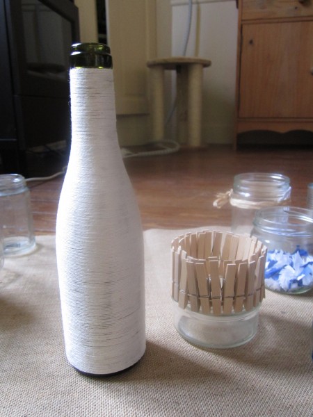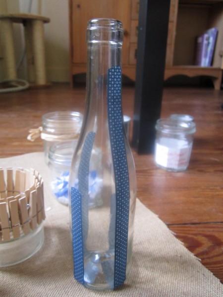 J'ai fait une bouteille avec juste le haut en bleu et le reste en blanc avec du fil de coton comme sur la photo c'est chouette aussi!