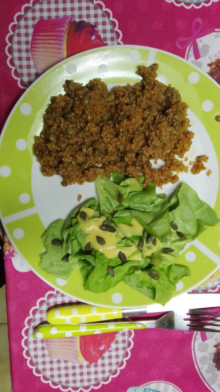 Quinoa et lentilles à la tomate , avec une petite salade vinaigrette végétalienne et petite graines de courge