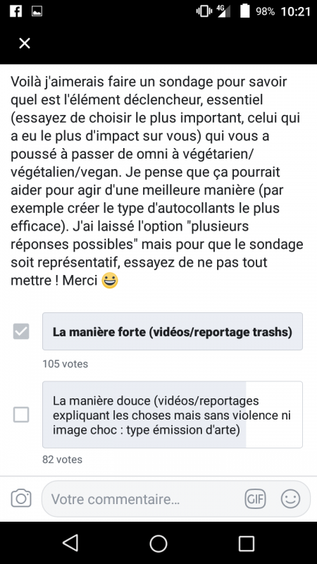 Après, ce qui me gêne énormément chez les végans, et c'est ce qui me freine à vouloir prendre cette étiquette, c'est le jugement incessant, la police constante, toujours à se mettre au-dessus des autres (qu'ils soient carnistes, végétariens, végétaliens ou végans) parce que "moi je fais pas ci, moi je fais pas ça".