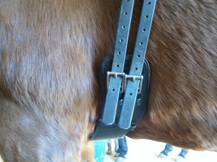 Le milieu de la sangle se met comme la sangle normale, juste derrière les antérieurs sous le ventre; et le reste de la sangle se dirige vers l'arrière, donc, verticalement, les sanglons tombent en face des contre sanglons de la selle. J'ai pris une photo pas très sanglé avant de partir, une photo en rentrant de la dernière balade, ça a pas bougé d'un poil, la selle n'a pas avancé du tout