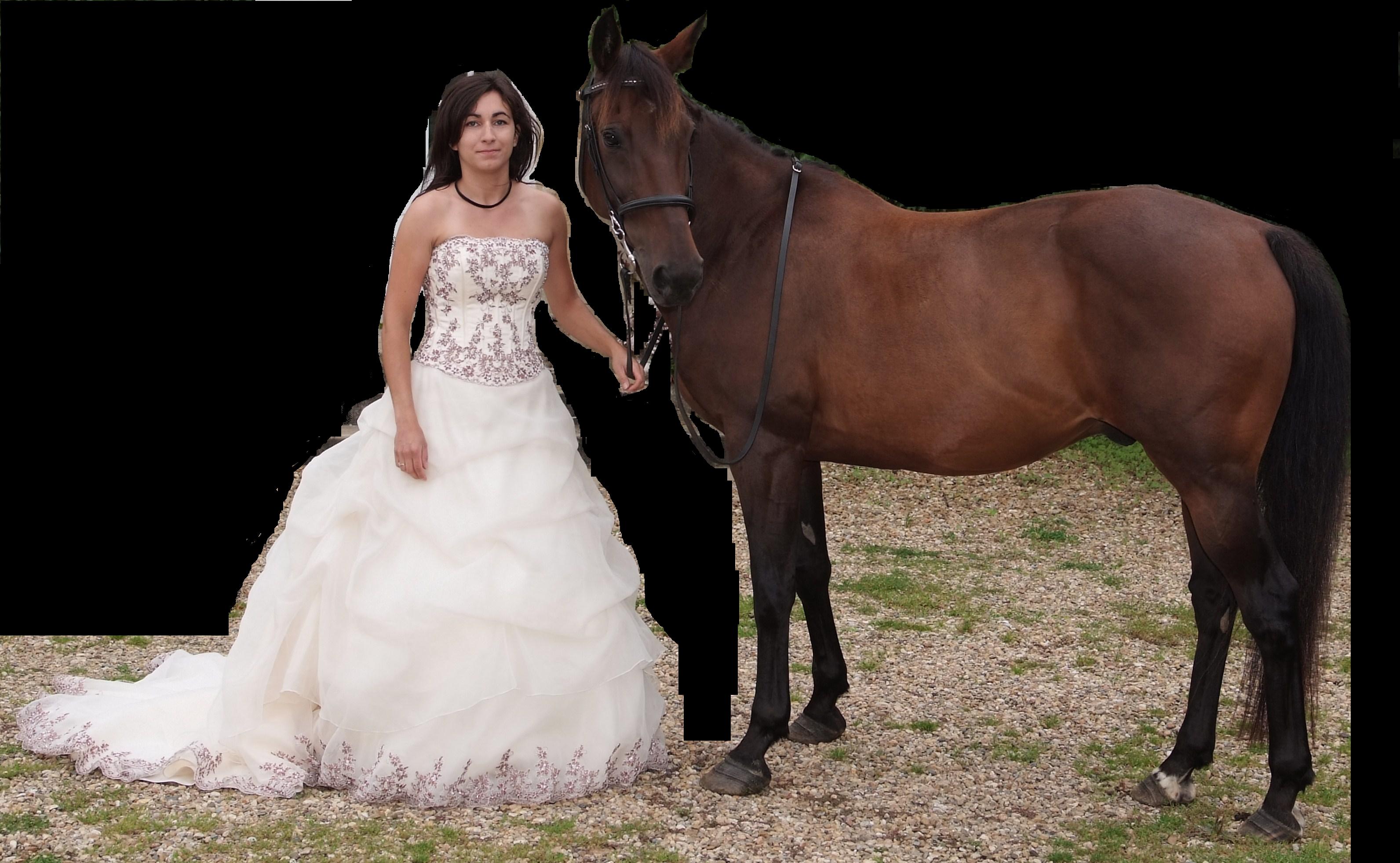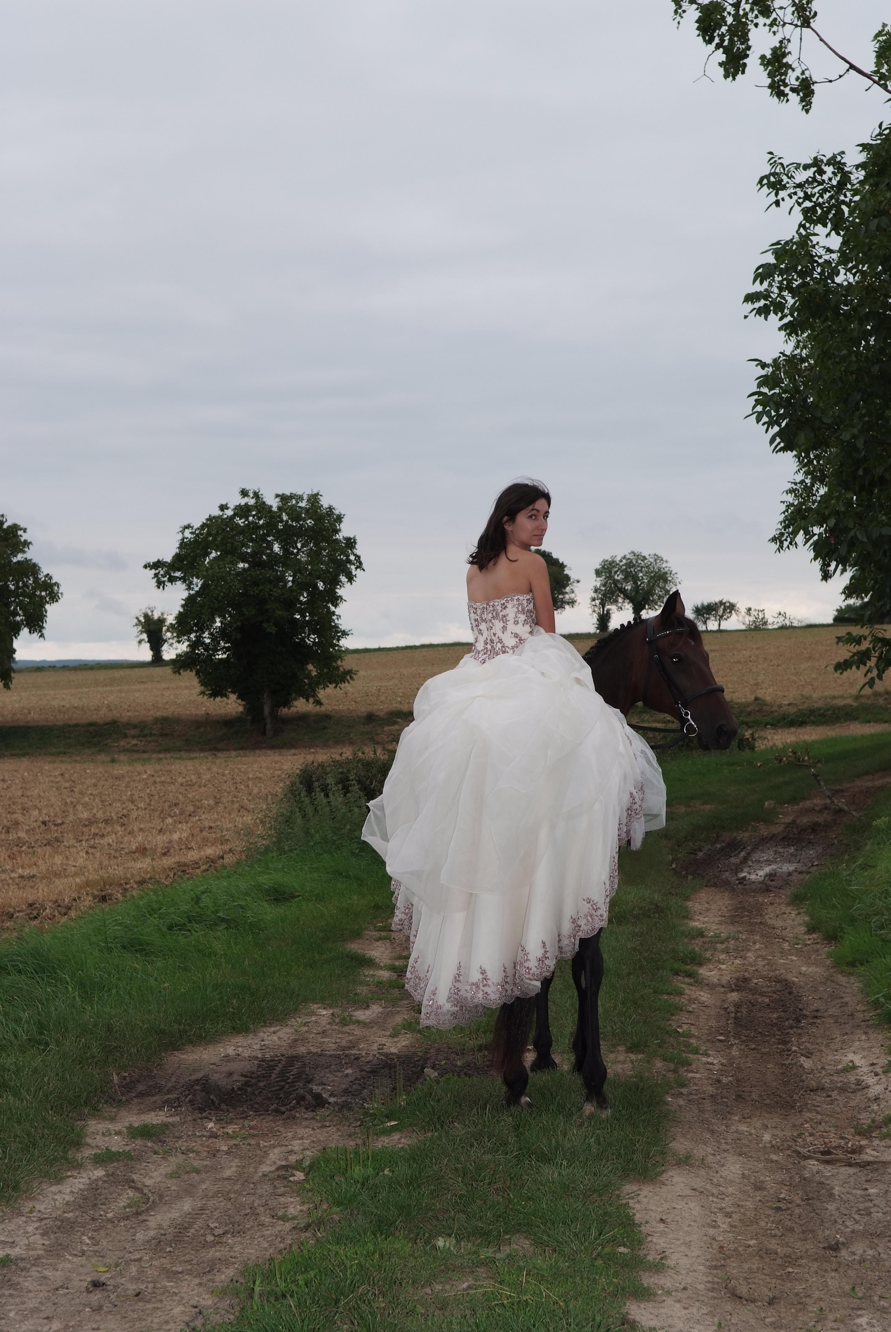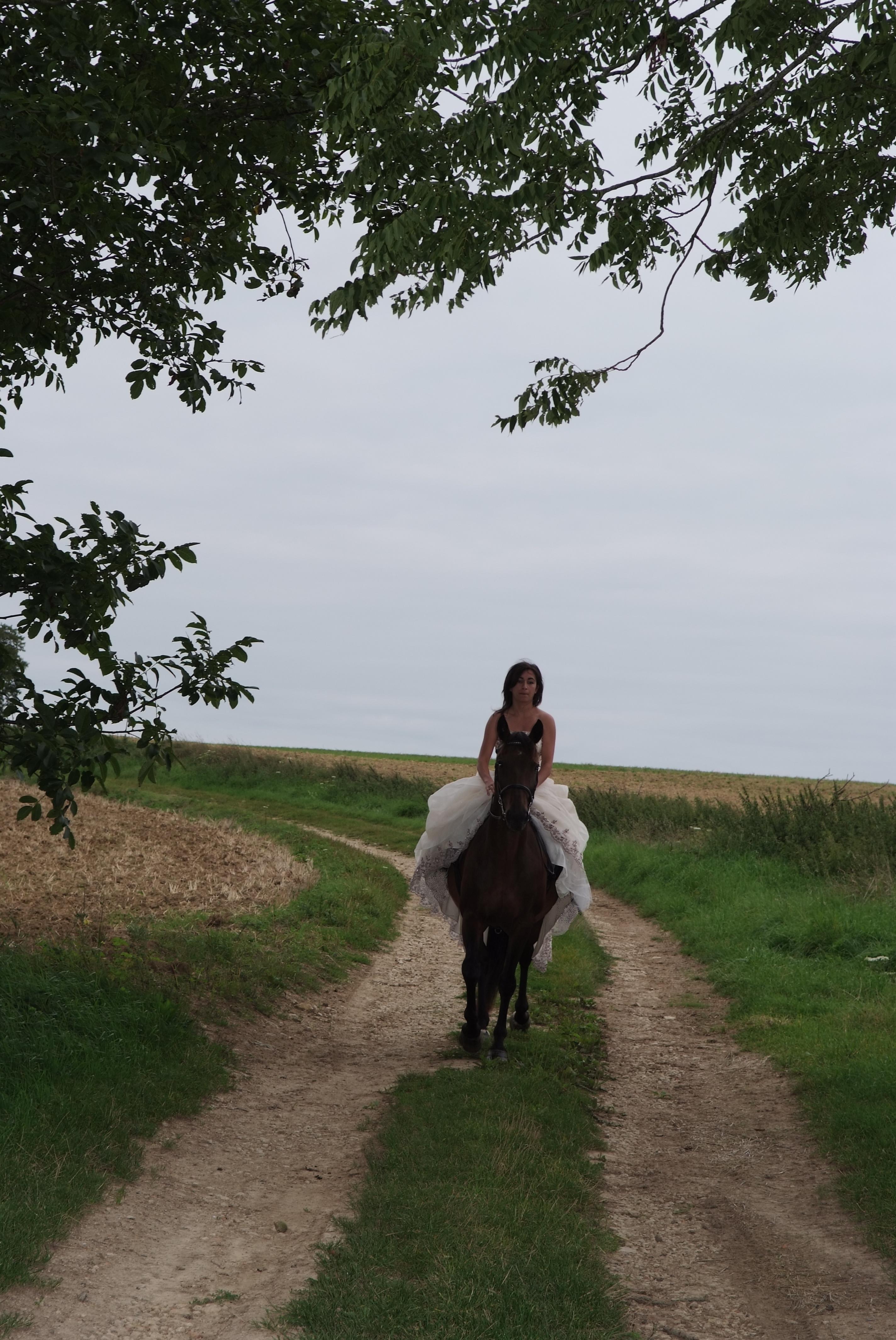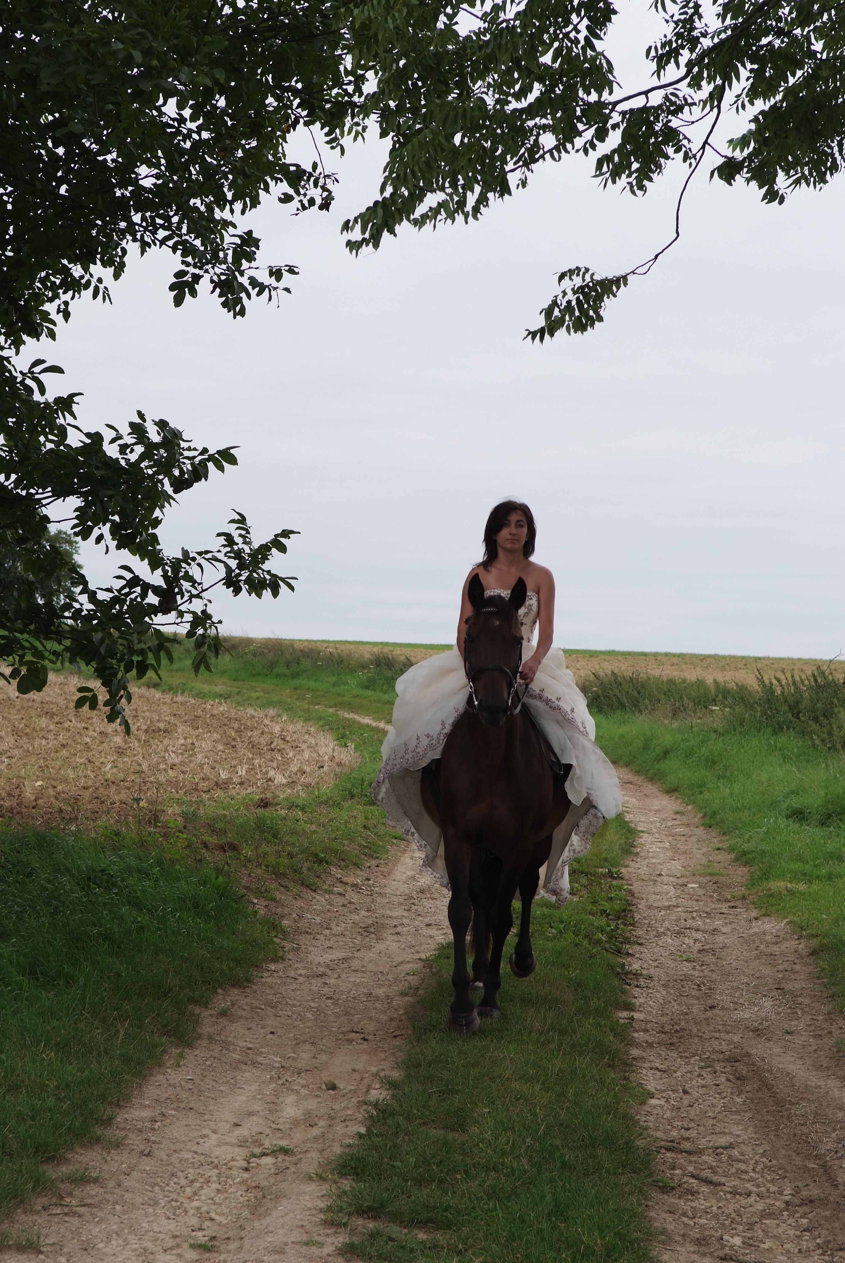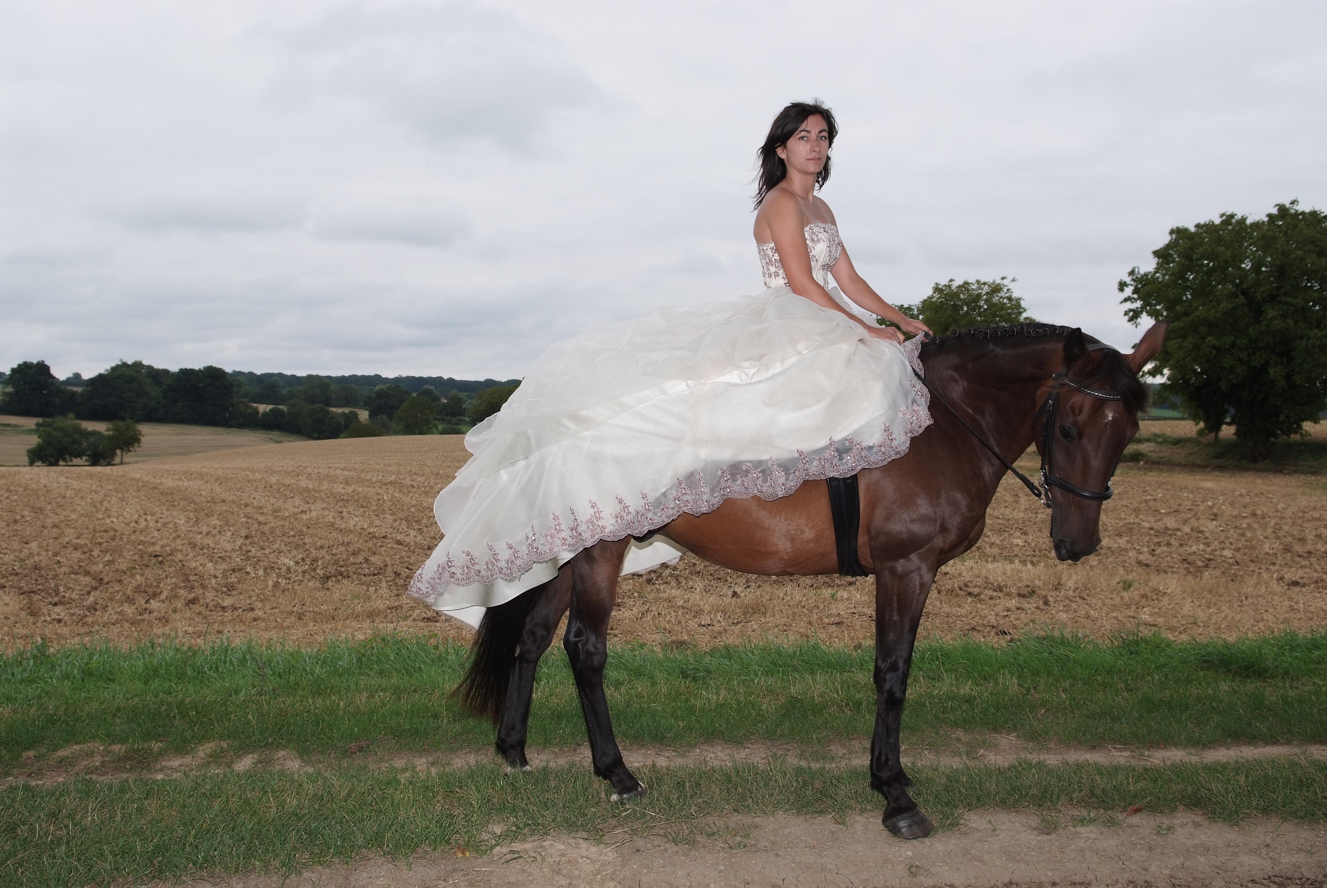 Kiwi a été mignon, un peu inquiet quand je suis retournée vers lui avec ma robe! Ensuite il était un peu agité quand on s'est éloigné des copains pour commencer les photos. J'ai fait quelques photos à pied et ensuite j'ai sellé pour monter, il a pas bougé (le photographe le tenait) alors que j'ai coincé ma robe sous mes fesses (et que les étriers étaient longs