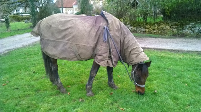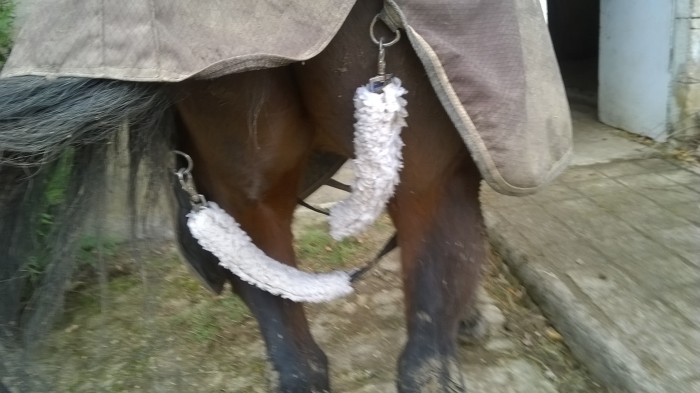 Bon ce midi je suis allée voir Kiwi vite fait. J'ai acheté à une copine deux fourreaux de muserolle, pour les mettre sur les courroies de cuisse de la couverture, car il n'a quasiment plus de poils là où ça frotte. Et je veux pas que ça lui entame la peau!