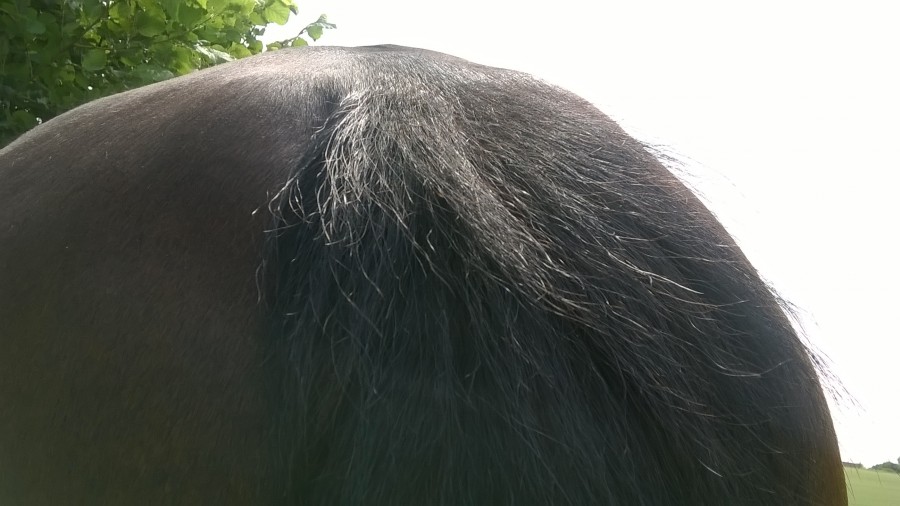 Dimanche matin je l'ai monté sur le plat. Après une longue détente au pas, j'ai essentiellement travaillé au galop, en faisant beaucoup de transitions entre galop et trot, puis galop et pas. Et toujours en essayant de l'avoir incurvé sans qu'il tombe sur l'épaule intérieure (j'ai quasiment uniquement travaillé en cercle).