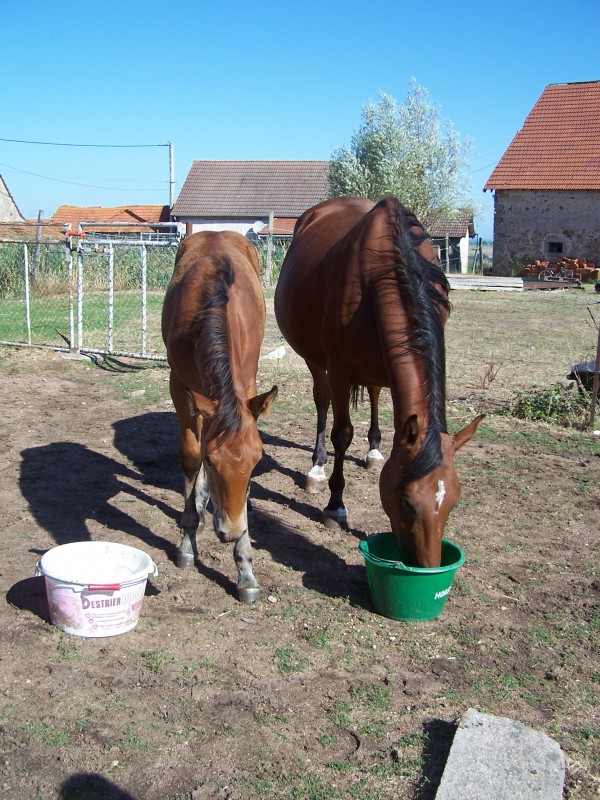 Lundi justement je suis allée monter Kiwi. Il faisait très chaud donc j' ai pas monté longtemps, 30 monutes environ. Au pas 15 minutes je l'ai mobilisé sur des epaules en dedans puis des cessions à la jambe. Il a pas mal travaillé. Ensuite j'ai galopé, sur des grands cercles. Il était tout rouillé mais bon c'est pas étonnant, ça faisait un mois qu'on ne faisait plus que de la balade!!