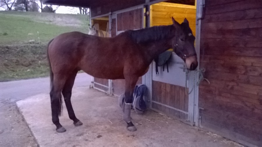 Du coup, pendant une semaine, travail en longe sans surfaix ni selle (le dos juste en arrière de la selle ne pouvait plus fonctionner à cause des blocages de l'avant main), puis reprise du travail monté au pas et au galop pendant une semaine, et la troisième semaine on peut rebosser normalement.