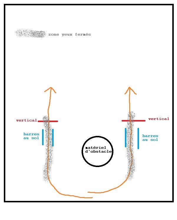 Donc on avait à chaque main un dispositif avec un couloir de barres au sol suivi d'un vertical (au départ la barre était au sol). On a commencé au pas à main gauche, dès qu'on termine notre courbe est qu'on est face au dispositif on doit fermer les yeux. Kiwi s'échappe à gauche, je l'ai senti sur le premier passage mais je suis pas intervenue assez fort ce qui fait qu'on frôle le chandelier mais pas du bon côté