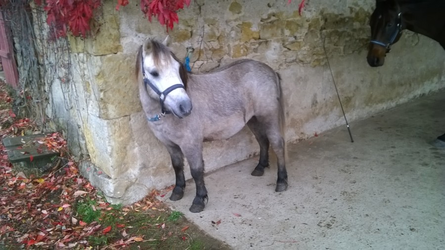 Aujourd'hui je l'ai longé 10 minutes dans la carrière pour la lui montrer. Il a été très chou, peur de rien (je lui ai montré les plots, les barres, la bâche...) et il a bien écouté pour la longe, même quand les poulinières et les poulains à côté ont galopé dans tous les sens parce qu'un shetland ça fait trop peur!!
