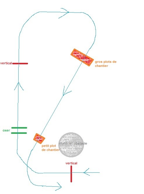 J'ai commencé par détendre sur le petit vertical tout en bas du schéma, à main droite. Je fais deux passages merdiques car je tire sur ma rêne droite pour tourner et en plus Kiwi repasse derrière à deux foulées du droit. Troisième passage nickel, j'ai le bon galop, je tourne avec ma rêne externe et je garde mes jambes une fois face à l'obstacle.