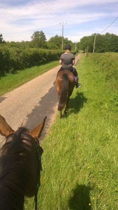 Dimanche je suis arrivée à midi à l'écurie. Je voulais monter Osi au pas, il est pas encore très carré. Finalement je l'ai sorti en extérieur pour voir comment il est, j'ai pris une petite route direction la forêt. Sur le bas côté en herbe il galérait pas, il marchait normalement. Cet andouille a eu peur d'un tronc qui sortait de la haie, il reculait il reculait j'ai cru qu'il allait me foutre au tas, pi au final non j'ai retrouvé la marche avant; on est passé sur la bas côté opposé au tronc. J'ai bien caressé et 10m plus loin j'ai fait demi tour. Ça suffisait pour une première sortie! On est revenu au pas sans encombre.