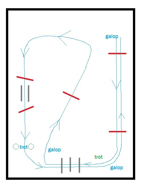 On installait le cheval au galop à main droite, on allait sur la ligne qui est sur la piste (au départ c'était juste des barres au sol); il fallait compter le nombre de foulées effectuées. Ensuite on passe au trot dans le coin, pour aller sur les trois barres au sol. On reprend le galop derrière pour aller sauter la croix située sur la diagonale. On vérifie qu'on réceptionne sur le pied gauche sinon on change. On va sur le double à deux foulées, les verticaux sont de biais et Michèle a installé entre les deux un couloir de barres posées au sol pour qu'on soit bien droit. Après, entre les deux bidons plastique (les cercles verts) on repasse au trot, on repasse sur les barres au sol, on prend le galop derrière et on retourne sur la ligne, où l'on doit faire une foulée de plus ou de moins qu'à l'aller.