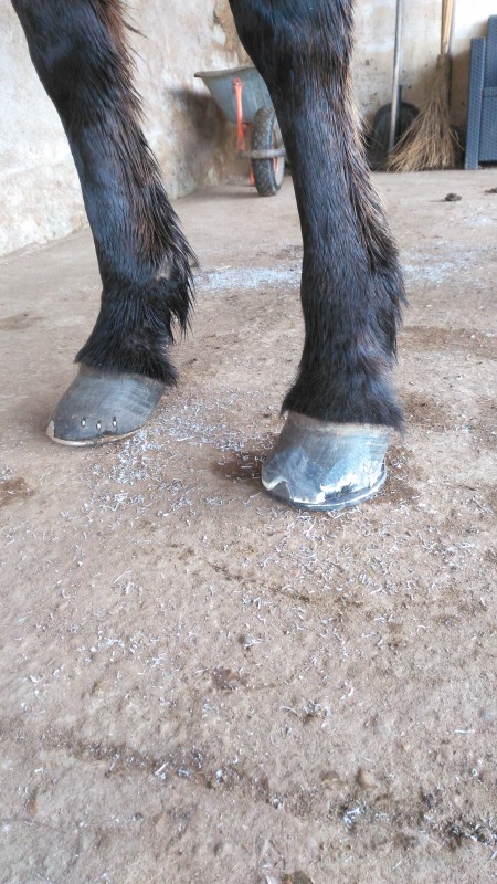 Il était mal ferré depuis longtemps (Hima je te mettrai une photo avec le pied droit anciennement ferré et ne nouveau fer au pied gauche), le pied ne s'écarte pas, la charge pondérale est concentré vers l'intérieur au lieu de porter sur les bords... Au lieu de faire une ajusture digne de ce nom (c'est à dire amincir un peu l'épaisseur du fer sur le bord interne), le fer était complètement incurvé, donc il ne pose pas à plat mais seulement sur la ligne interne quoi. Truc de fou