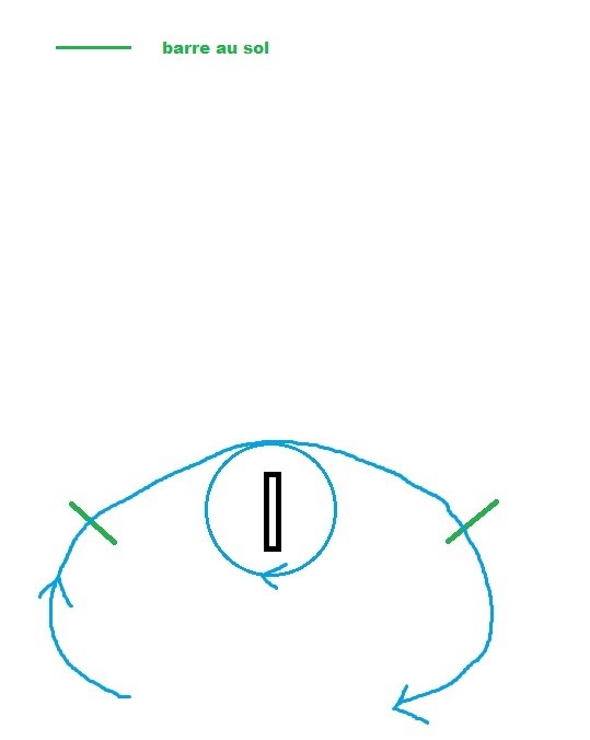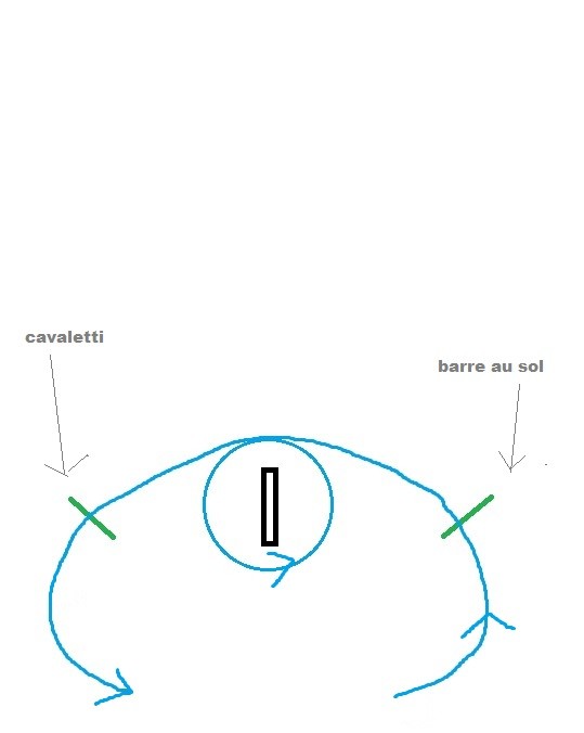 Donc le cheval était parfois un peu flottant devant les barres mais ça s'est amélioré. Pour le petit cercle autour de la poutre, il tournait très bien avec mes aides externes. Bon il avait tendance à se traverser un peu.