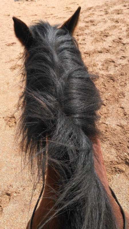 Et bizarrement à main gauche c'était presque plus difficile qu'à droite. Enfin au pas ça s'est pas trop ressenti, c'était plutôt au trot que j'ai vu la différence. Donc au lieu de faire vraiment un huit, des fois je restais sur le même cercle pour pas changer de main trop souvent et faire un petit progrès avant de repasser à l'autre main.