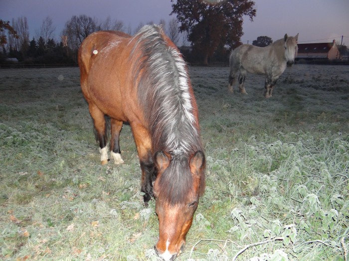 Notre étalon est toujours aussi mignon, ils ont tous les deux sacrément de poils mais avec les -4°C, nous avons remis les grosses couvertures quand même