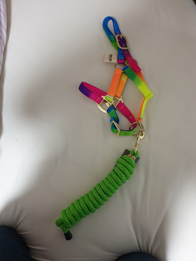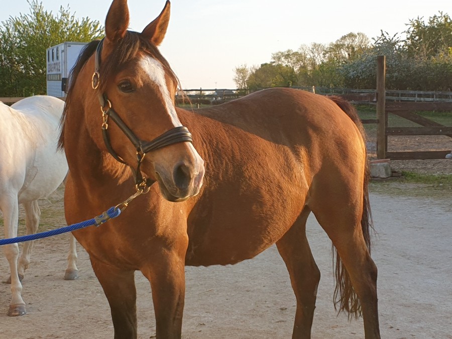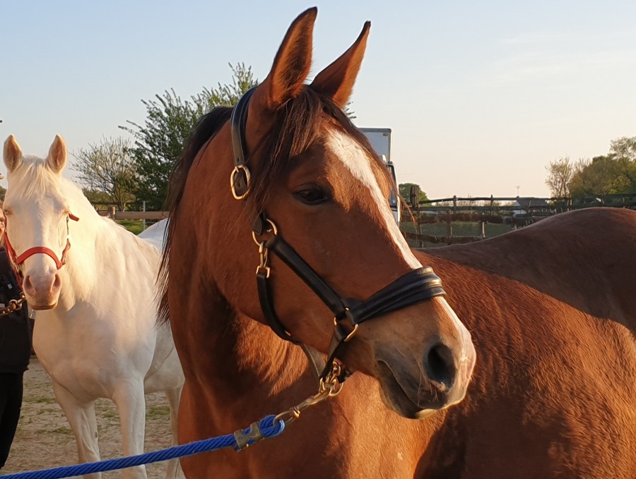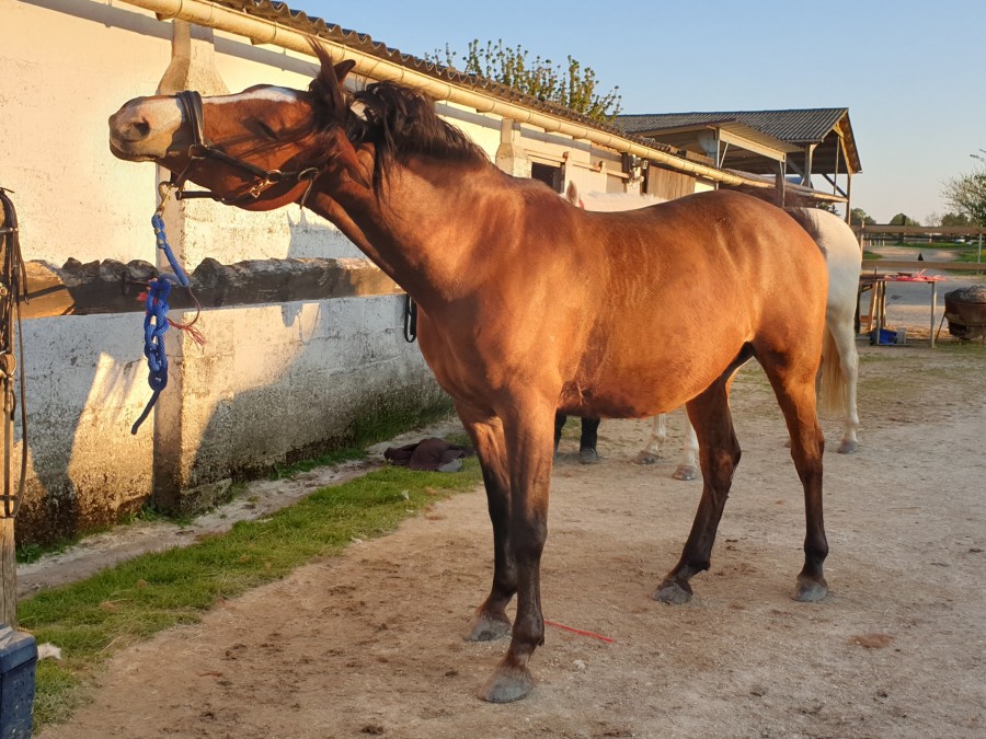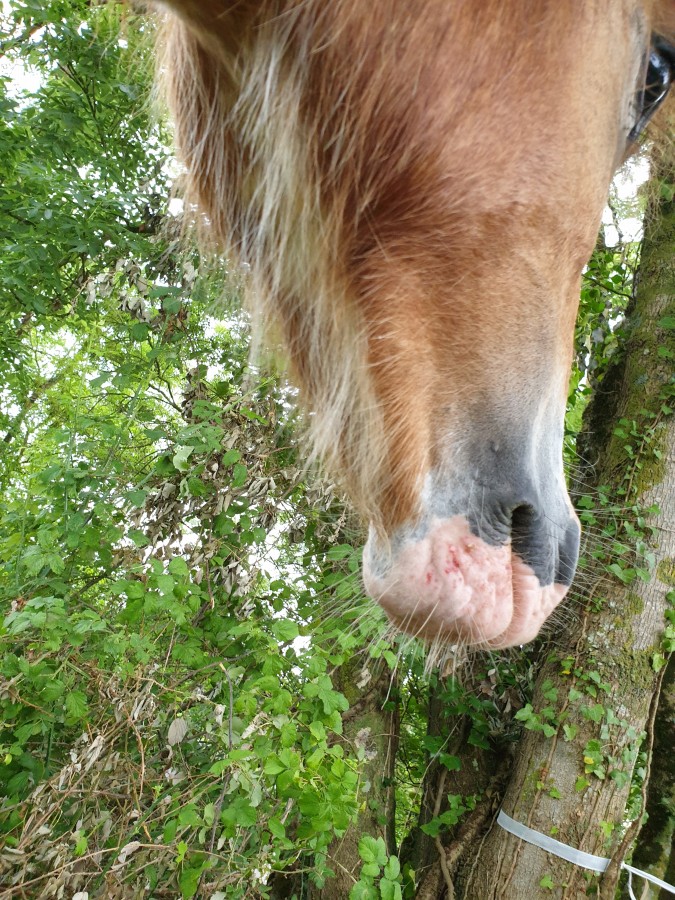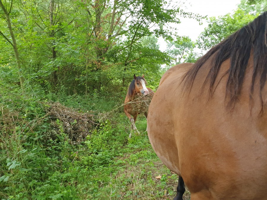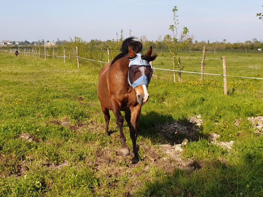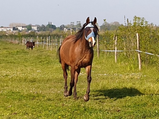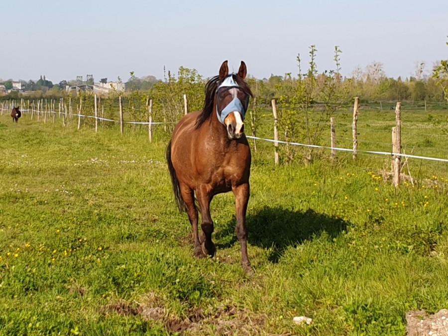 Arrivee aux écuries j enleve le flymask. je commence par le cote gauche et la Uranie me laisse pas le temps de retirer l autre cote qu elle s affole tire au renard et casse la ficelle. Puis tournois sur elle meme, finie par s accroupir et tombe sur les fesses. On arrive a lui enlever. Aucune boiterie. soulage!. Au final qu une égratignure au jarret. la miss et ensuite calme comme une image. l objet terrifiant n etant plus la! Au moins elle a le mérite de vite redescendre en pression.
