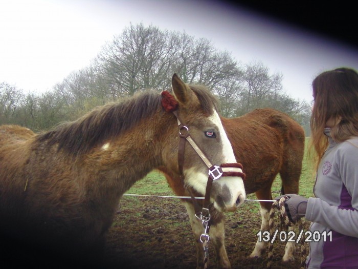 Tranquillement,j'arrive à rattraper le poulain qui est venu vers moi!!!Donc super,je le tiens en longe..Hinto Bly tirait un peu beaucoup sur la longe,normal vu qu'il n'a jamais été manipulé..il se détends un peu..deviens plus docile...j'ai pu lui changer de licol pour le remettre au parc avec mes chevaux puisqu'ils étaient prêt à l'accepter.(tant mieux car le jeune lui avais mal mis le licol pauvre poulain en plus bien trop grand..).