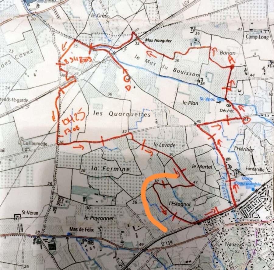 La voici, en orange l'endroit où j'ai merdé (je n'ai pas prit le virage et je suis allée jusqu'à la nationale juste avant le Mas de Félix)