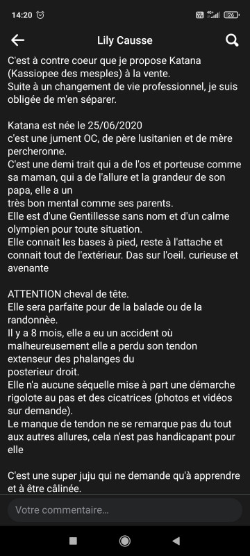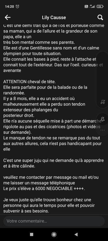Jument avec un tendon en moins, à la démarche "rigolote" dixit la vendeuse