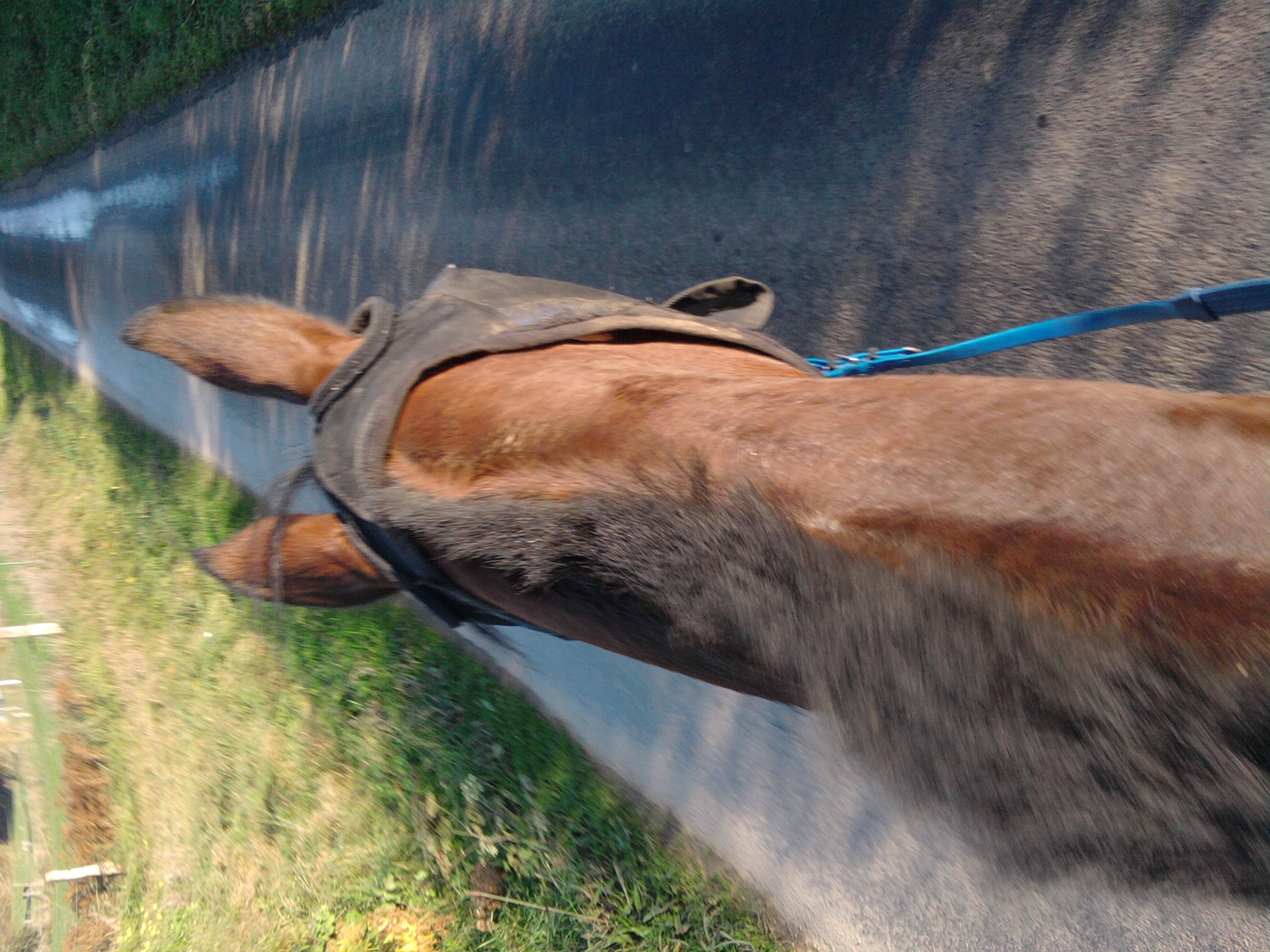 Il galopait bien dans le champ il est capable de descendre au pas, je prend mes distances pour lui laisser de la marge et gérer ses foulées (de pas/trotinant)