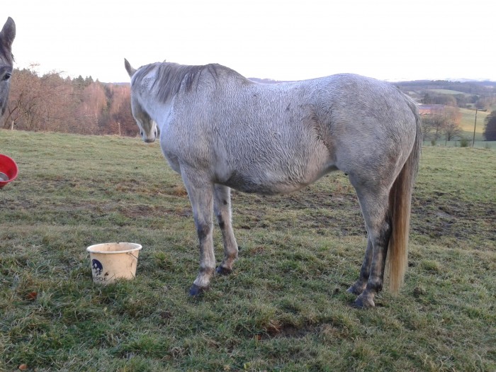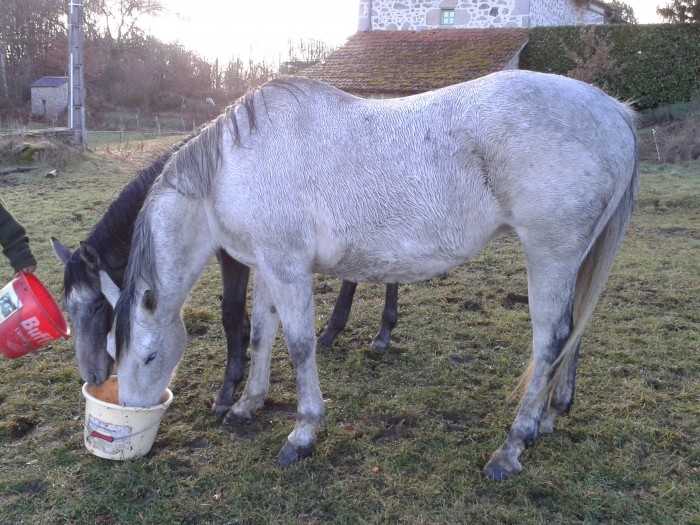 - ALFA SF par Poor Boy x Enchanteur AA, 15 ans, 1m63, dite JUNIOR puisqu'elle a le même nom que sa mère. Testée saine à la PSSM.