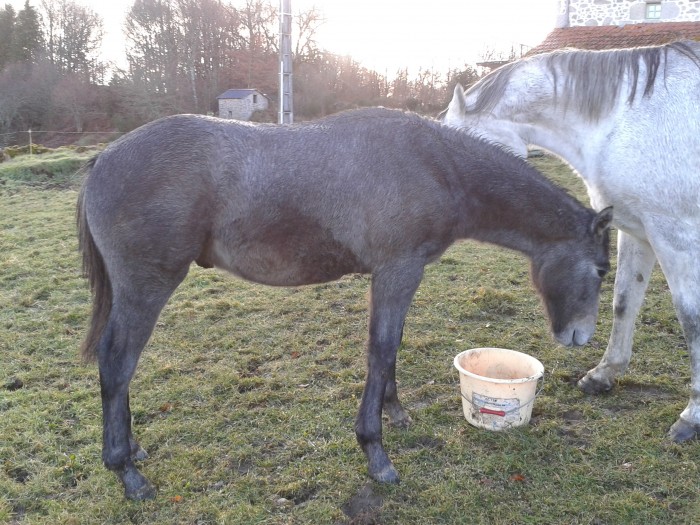 Deryn est constament au foin , il a un bon casse croute il est tres gras , il était déjà ventru comme ça il y a 2 semaines j'avais pris des photos que je viens d'aller regarder , et puis j'attends ses 8 mois au moins pour lui faire une ivermectine , doit y avoir une colonie de gasterophiles là-dedans !