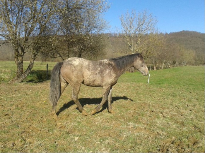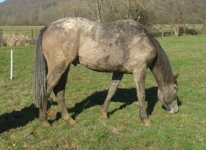 - ALFA SF par Poor Boy x Enchanteur AA, 15 ans, 1m63, dite JUNIOR puisqu'elle a le même nom que sa mère. Testée saine à la PSSM.